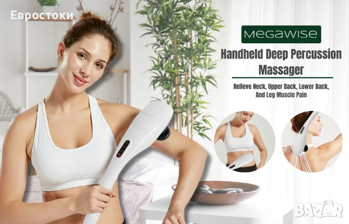 За вашето здраве. Електрическият ръчен дълбокоперкусионен масажор MEGAWISE може ефективно да стимулира кръвообращението. Той също така помага при подуване и болка в раменете, врата, гърба, ставите, стъпалата, краката и кръста. Използвайте този инструмент, за да си помогнете с мускулна умора и болка.