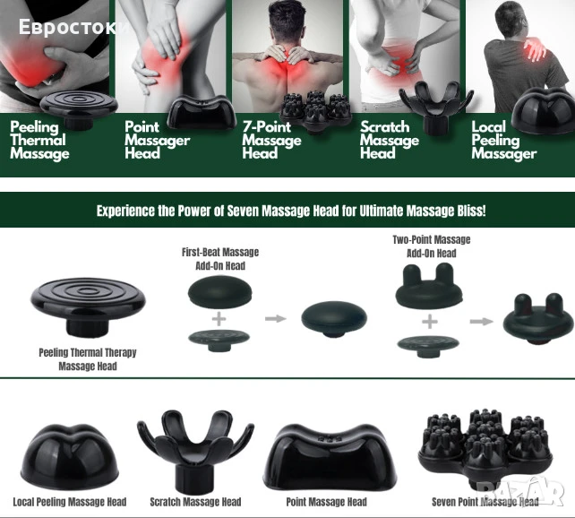 • Седемточкова масажна глава. Покрива по-голяма масажна площ. Идеална за гърба, кръста, краката и др.