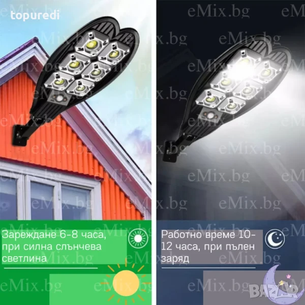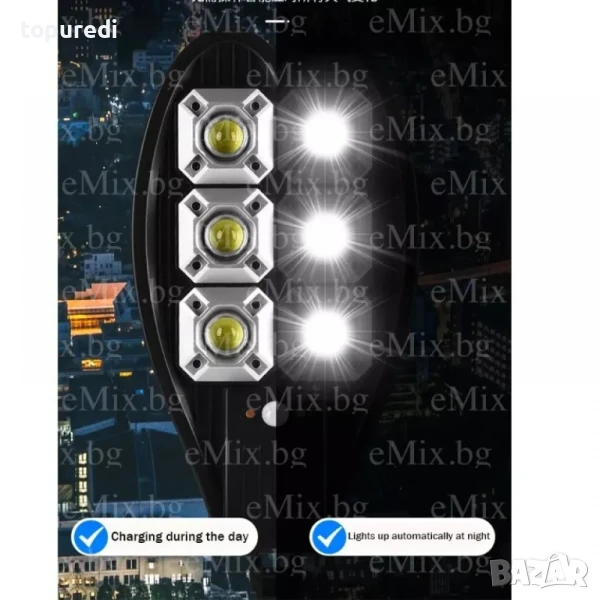През деня високоефективният слънчев панел събира енергия от слънцето и я съхранява в усъвършенстваната литиева батерия. През нощта мощният светодиод автоматично – ще се включи, за да осигури светлина.