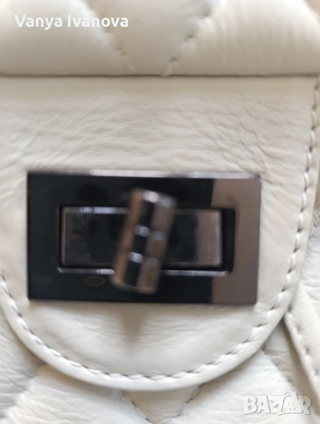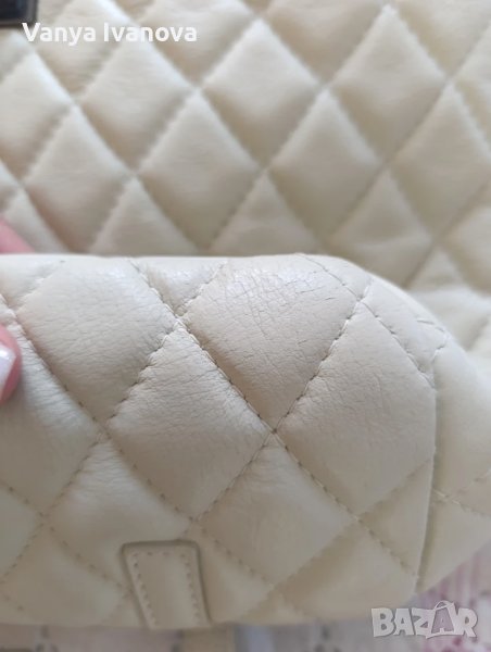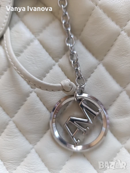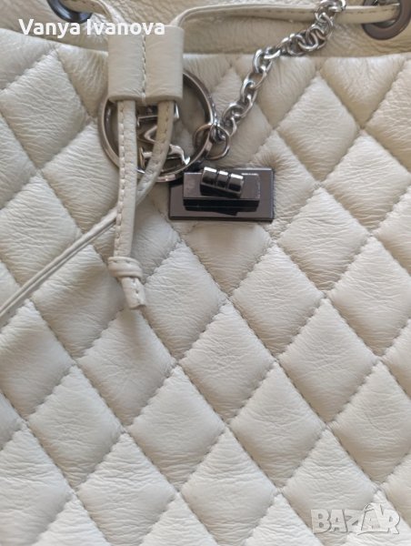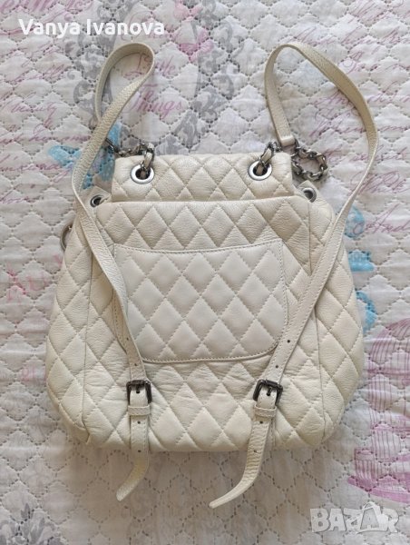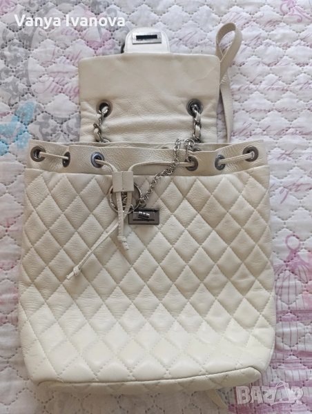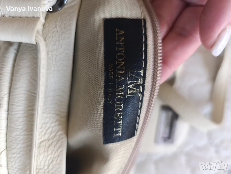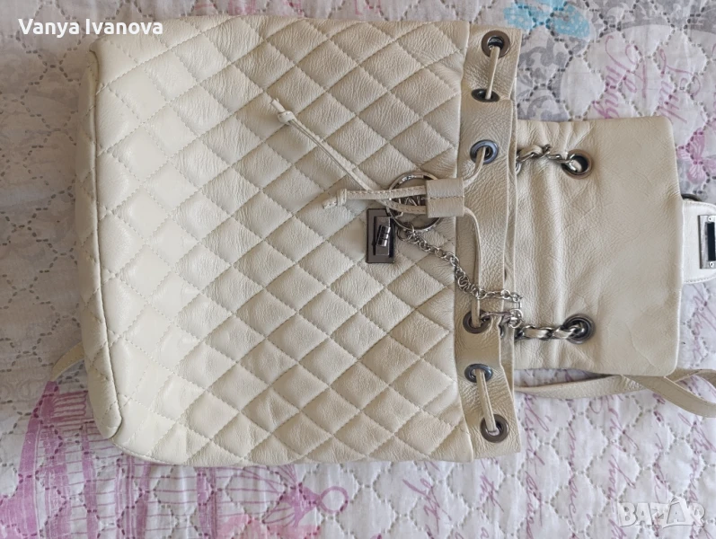 Раница на Antonia Moretti, цвят бежов(слонова кост).Метални части и детайли тъмно сребро.Има едно голямо отделение, има въртяща се закопчалка, дръжките са си нджир и кожа.Единствена дребна забележка на долния десен ъгъл(снимки 10 и 11).Дебела капитонирана естествена кожа.