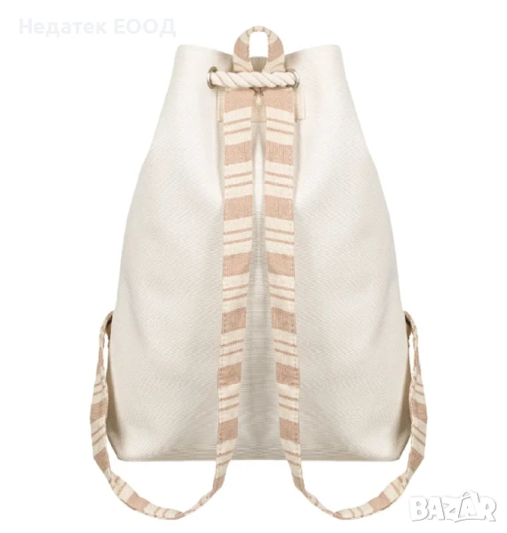 Лятна раница за жени, изработена от плат и юта, с дебело закопчаване с въже, вътрешен джоб и раирани платнени презрамки за гърба. Идеален аксесоар за плажа или за разходка.