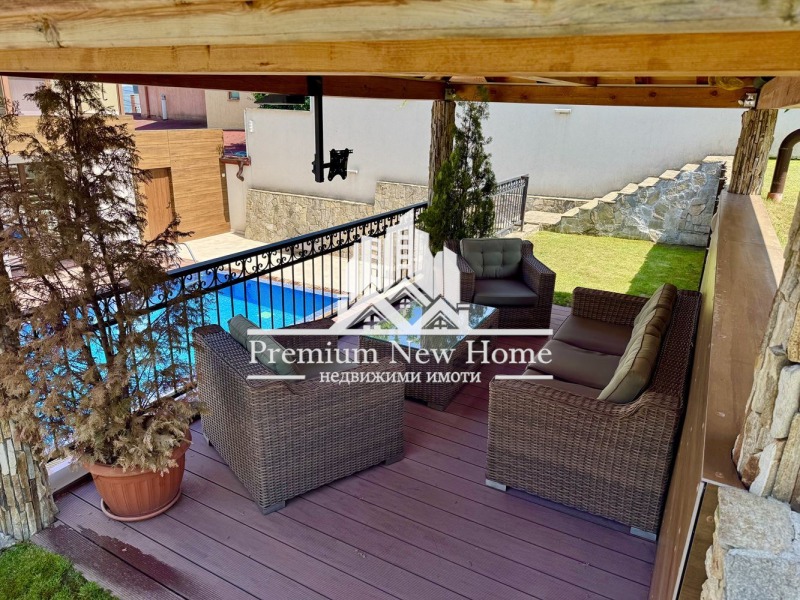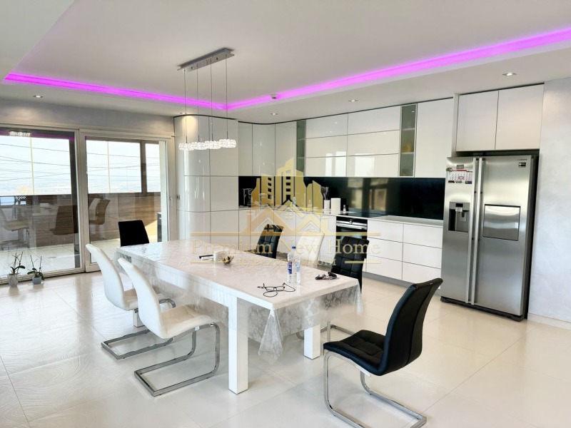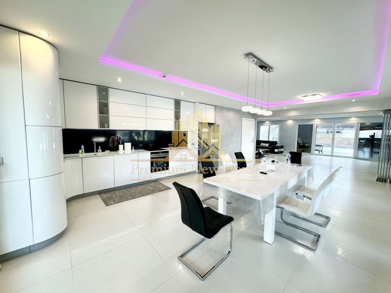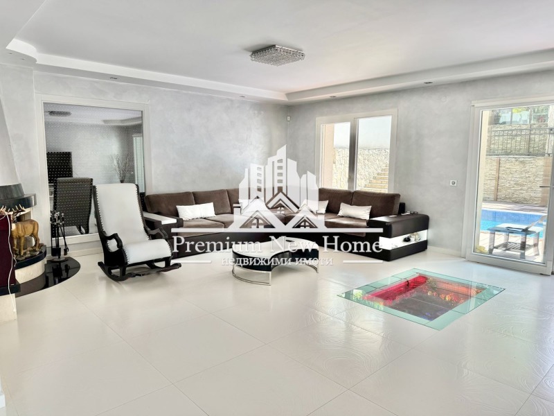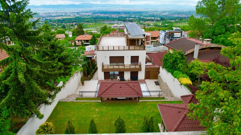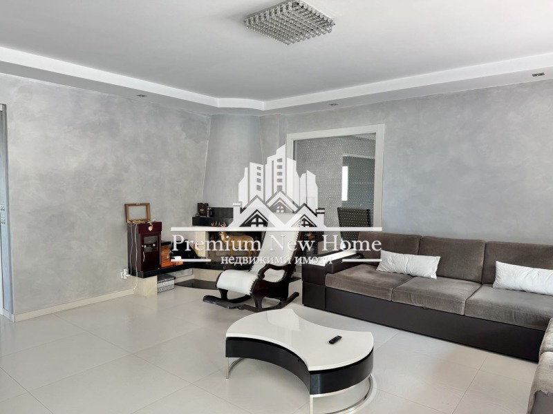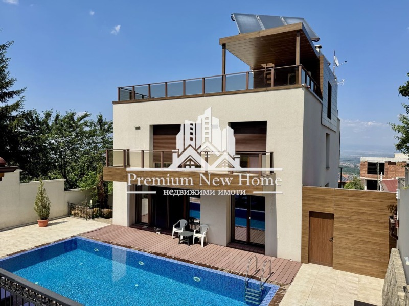 ЛУКСОЗНО ОБЗАВЕДЕНА ! ! ! ПРОСТОРНА ! ! ! 360 ГРАДУСА ПАНОРАМНА ГЛЕДКА ! ! ! ЧИСТ ВЪЗДУХ ! ! ! Предлагаме на вашето внимание триетажна къща, със следното функционално разпределение: партерен етаж - гараж за шест коли, първи етаж - дневна с трапезария и кухненски бокс, с вграден аквариум в пода, и с излаз на веранда; втори етаж - четири спални, една от които е със самостоятелна баня с тоалетна и баня с тоалетна; трети етаж: покривна тераса. УДОБСТВА: Камина, електрически входни врати от ковано желязо, електрическа врата на гаража 5 метра широка и 3,5 висока,
