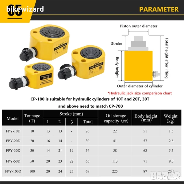 крик. [Малък и практичен размер] Лек и лесен за транспортиране, хидравличният крик има два отвора.Този хидравличен крик трябва да се използва с хидравлична помпа, в противен случай налягането на маслото не е достатъчно, за да издържи на нормална употреба. 10T / 20T трябва да се използва с хидравлична помпа CP-180 (ASIN: B07W7ZVW77); 30T / 50T / 100T трябва да се използва с хидравлична помпа CP-700 (ASIN: B07WHJHC1K)