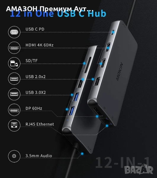 MOKiN 12в1 USB-C докинг станция за два монитора/100W PD/троен USB C хъб с 2 HDMI/DisplayPort/Gigabit