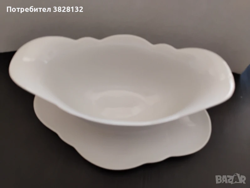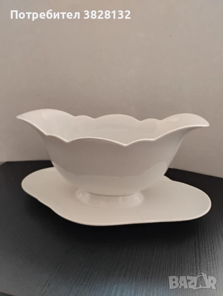 сосиера с прикрепена подложна чиния-сн.4-6 височина 9см, ширина 13см в най-широката част на чинията, дължина 18см, бял глазинан порцелан, маркиран- марка порцелан "Seltmann Weiden" от Бавария, Германия.Seltmann Weiden" е един от водещите производители на порцелан в Германия, с над 200 години опит в производството на висококачествен порцелан, без забележки, без следи от употреба.