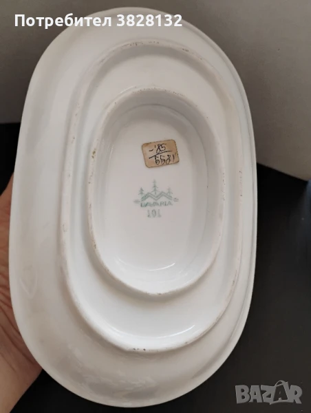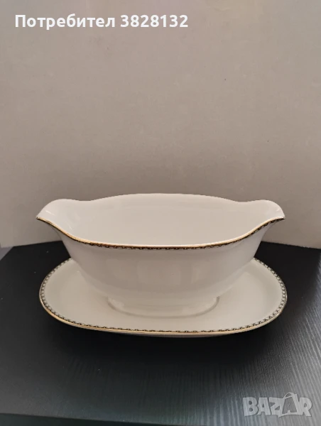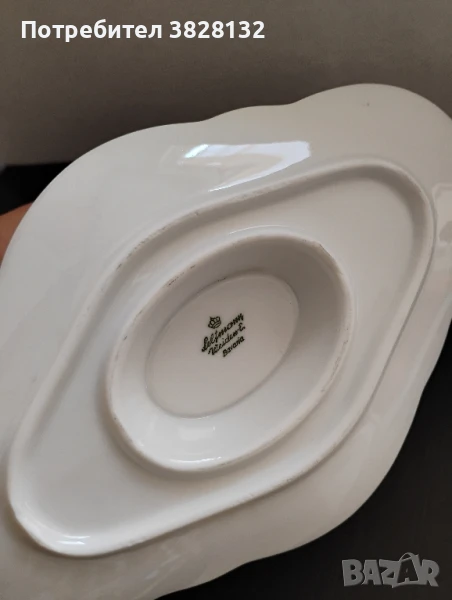 Сосиера с прикрепена подложна чиния -сн.1-3 височина 8см., ширина 10.8см, дължина 18.5см, бял глазиран порцелан, украсена със златно по ръба, без следи от употреба, маркировка"Bavaria" указва, че порцеланът е произведен в Бавария, регион в Южна Германия, известен с производството на фин порцелан през 18-ти и 19-ти век, цена 40лв.