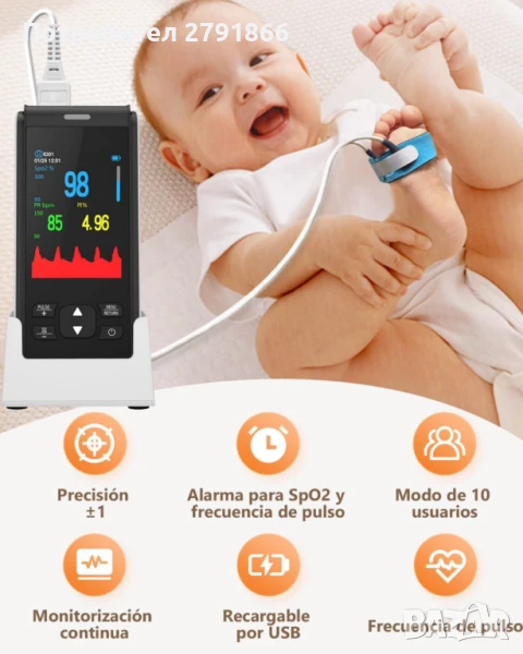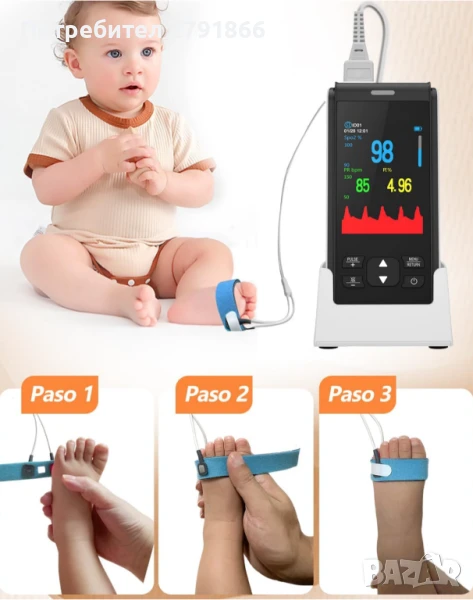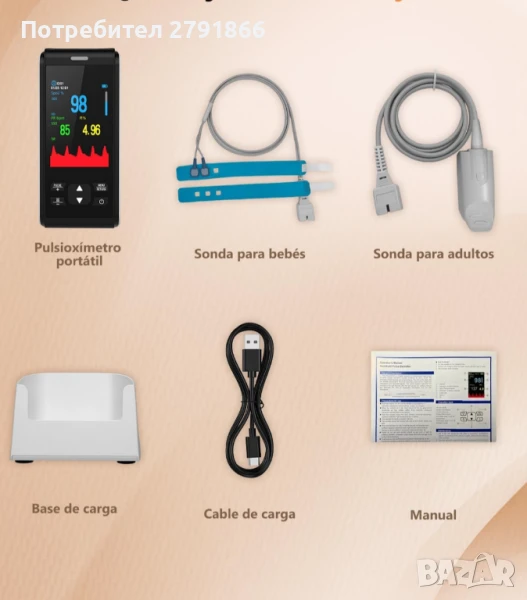 - Комплектът включва 1 ръчен пулсов оксиметър, 1 сонда за възрастни, 1 сонда за бебета, 1 зарядна база, 1 USB-C кабел за зареждане, 1 защитен калъф за оксиметър, 1 ръководство за потребителя
