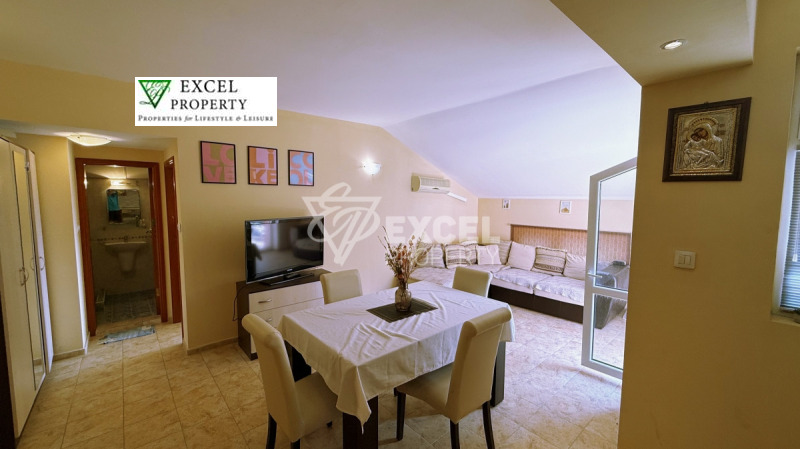 Апартамент с гледка море в Свети Влас!! Ексел Пропърти предлага на продажна апартамент с гледка море в Свети Влас. Имота е светъл и слънчев, намира се в комплекс Залив и е напълно обзаведен. Намира се на последния четвърти етаж в сграда без асансьор и е с обща площ от 52 кв.м. Разполага с просторна всекидневна с кухненски бокс, спалня, баня и два балкона. Обзавеждането включва ъглов разтегателен диван, маса за хранене с четири стола, и кухня с всички уреди като фурна, котлони, хладилник, аспиратор, ТВ сет и климатик. Спалнята е оборудвана с двойно легло с нощни шкафчета, гардероб и климатик. Към спалнята балкон има източно изложение и страхотна гледка към морето и планината. Апартамента е подходящ за отдаване под наем или целогодишно ползване. Комплекса е на 50м от морето, разполага с басейн, като в близост ще намерите целогодишно работещ мини маркет, спирка на градския транспорт, училище и детска градина. Комплексът е с АКТ 16 и разполага с басейна и зона за шезлонги и чадъри. Таксата поддръжка е 450 Евро на година.