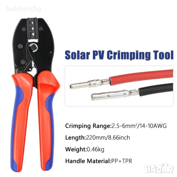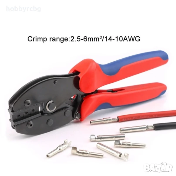 Клещи YFYM010 за кримпване на фотоволтаични кабели с големина 14-10AWG. Ергономична дръжка и управление с тресчотка.