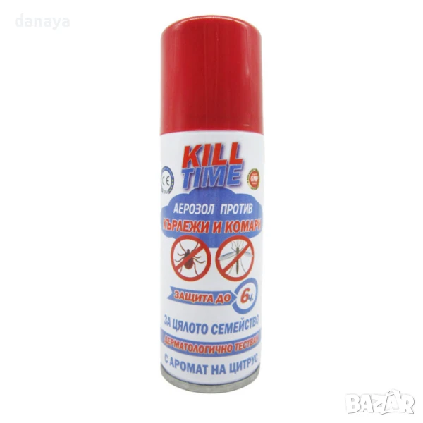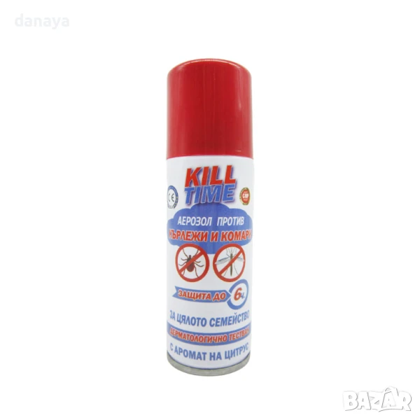 Спрей за тяло против комари. Спрея против комари Kill Time е препарат който осигурява гарантирана защита срещу комари, кърлежи и други насекоми. Със своята до 6 часова защита предпазва цялото семейство от досадните насекоми.