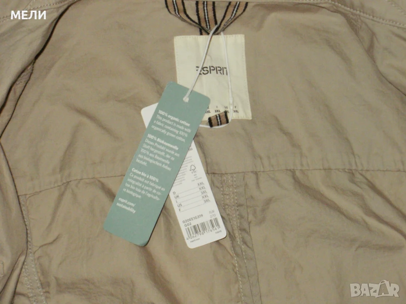 Сакото е на ESPRIT, оригинално, ново с етикети. По номер е 2XL, сравнете мерките. Цвета е като на снимките карамел, много актуален. Материята е тънък плат от 100% памук. Коланчето е многоцветно, сакото може да се комбинира с много цветове. Без подплата е, отпред има четири джоба с капачета и с копчета. Леко вталена кройка е, практична и удобна дреха. Истинската му цена е 80 евро.