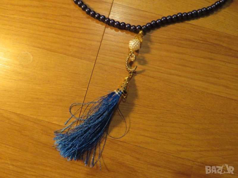 броеница, тъмносиня османска броеница със златисти орнаменти , турска броеница с 99 мъниста с който мюсюлманите отброяват повтарящите се молитвени формули и имената на Аллах.