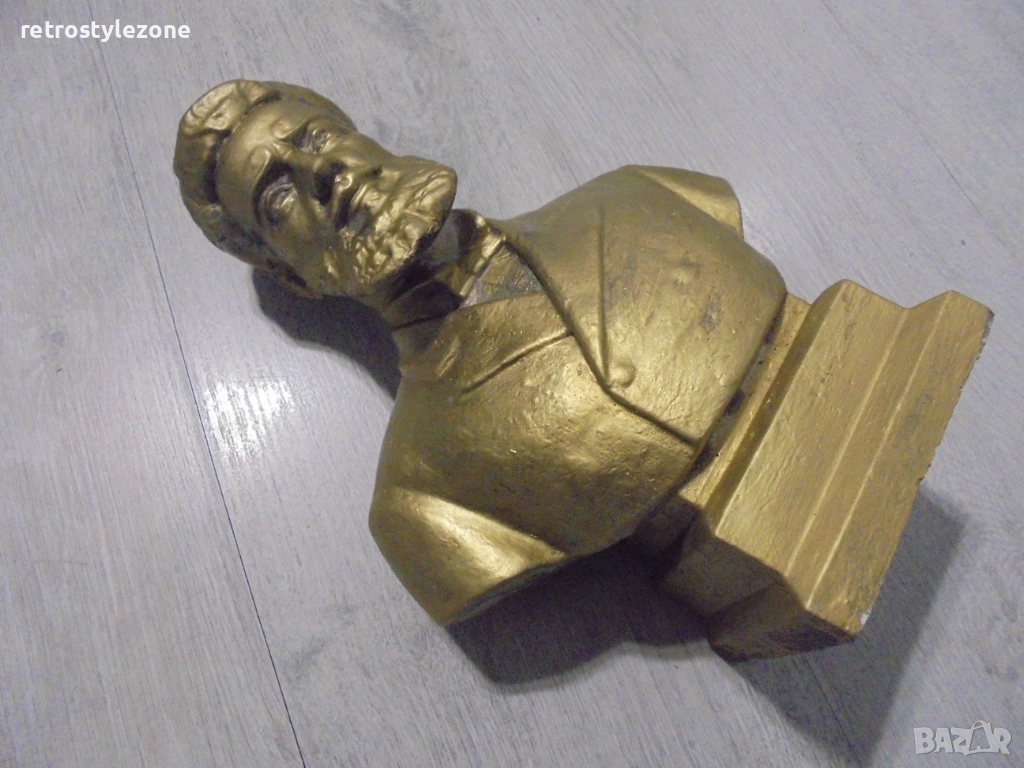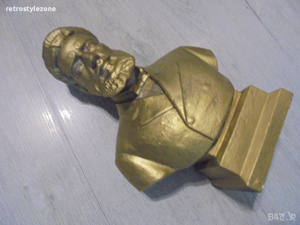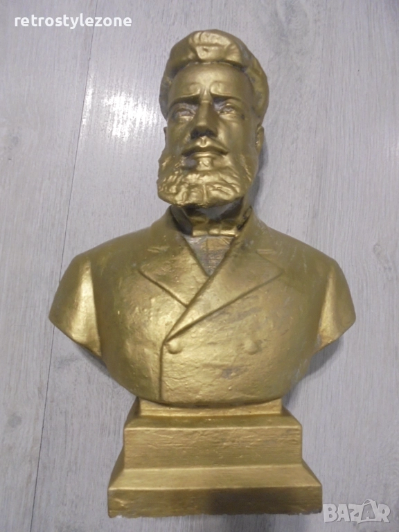 Бюстът е с класическа визия, ясно изразени черти и патинирано покритие в златист тон, което подчертава детайлите и придава представителен вид.
