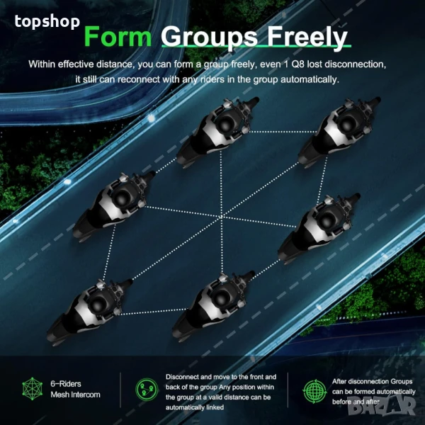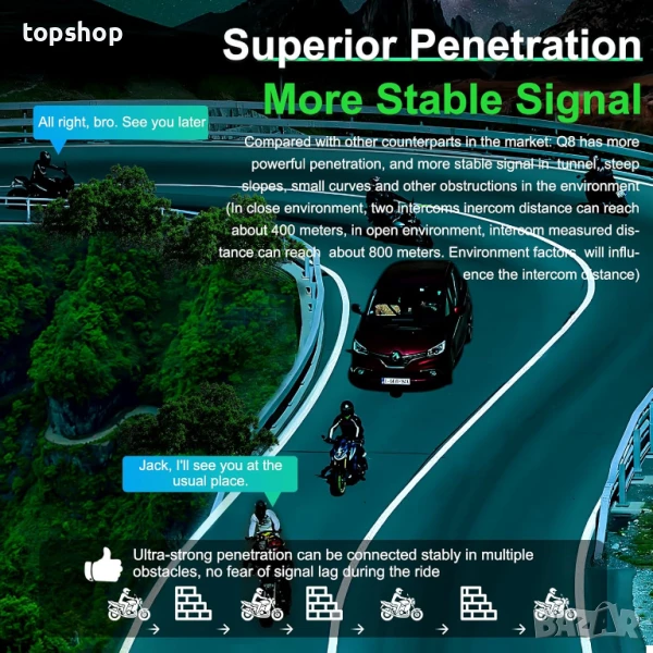 Разстоянието обхваща 1000M. по-широк комуникационен обхват, по-силно проникване и стабилен сигнал в тунели, стръмни склонове, магистрала с висок трафик и друга среда с препятствия. Разстоянието на интеркома на група 6 ездачи може да достигне 600-1000 метра.
