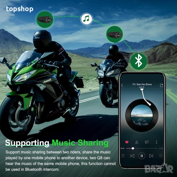 Поддържа общ звук. Позволява интерком, музика и FM едновременно. Когато FM е включен. FM може да се чуе в интерком режим. Докато се сравнява добре с телефона. Музиката е разрешена и в мрежест интерком режим