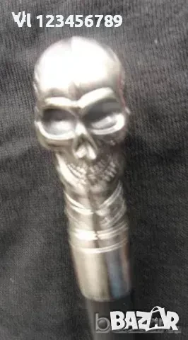 Ръкохватка - череп, двуделен, с размери около 44 х 55 х 55 мм изработен от сплав на цветни метали -в еликолепна имитация на патинирано сребро.