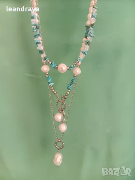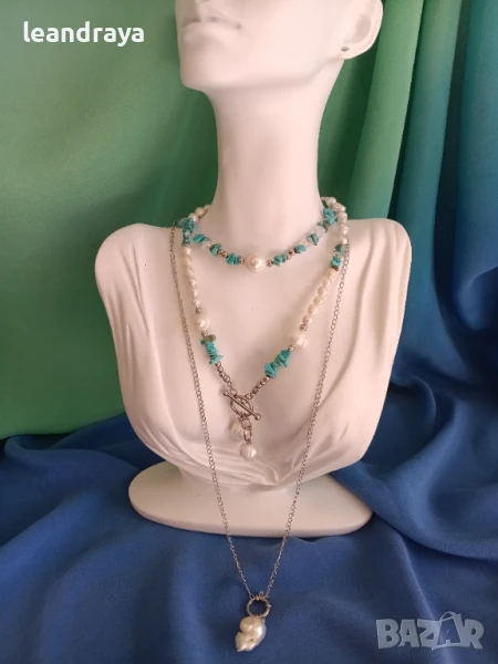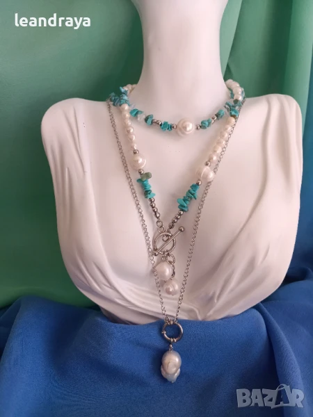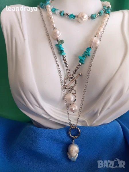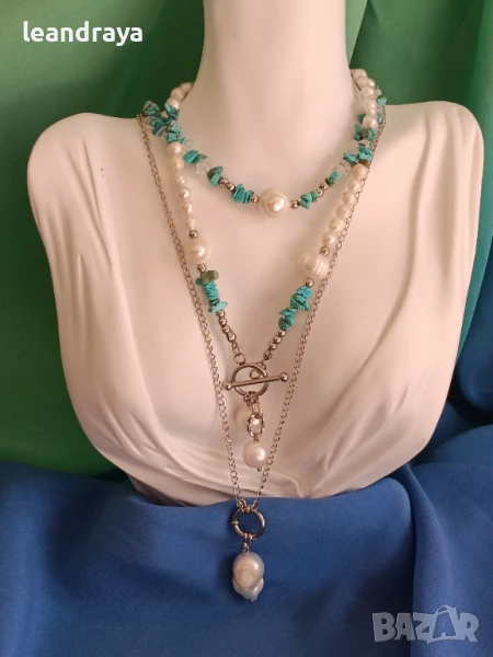 Три колиета от естествени перли, стомана, хаулит и опалит. Барокова перла на най-дългото с размер 20 на 15 мм. Могат да се носят заедно и отделно.