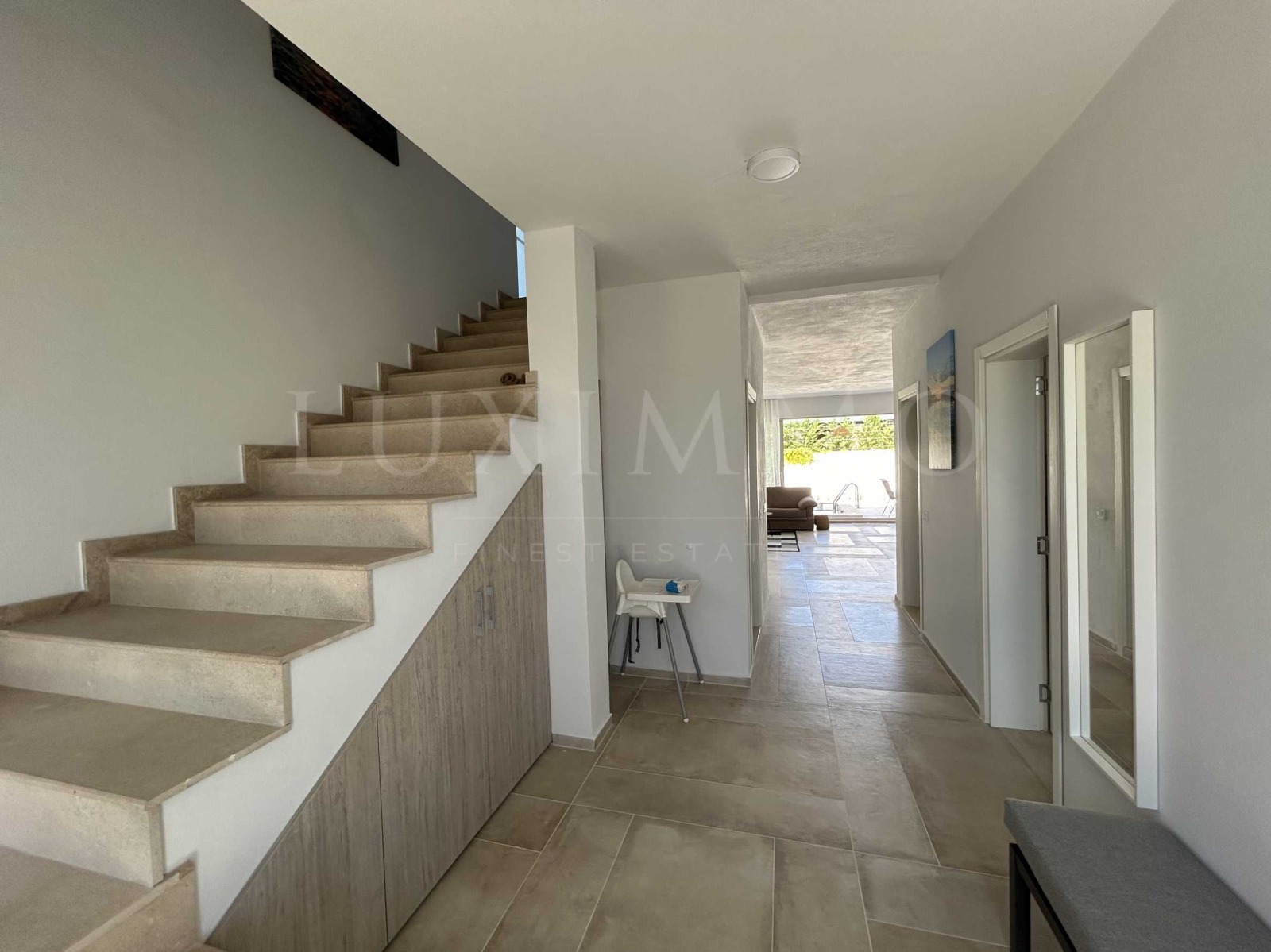 първи етаж: входно антре, всекидневна с трапезария и кухня, веранда към басейна, една спалня със самостоятелна баня, тоалетна за гости, склад, вътрешно стълбище;