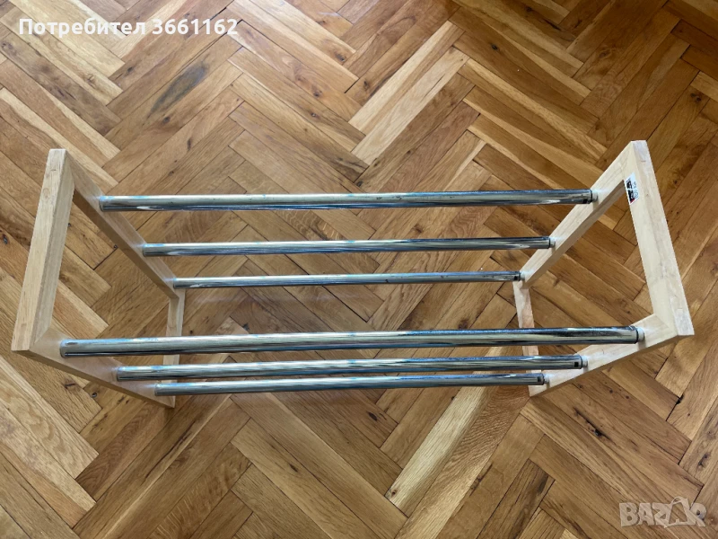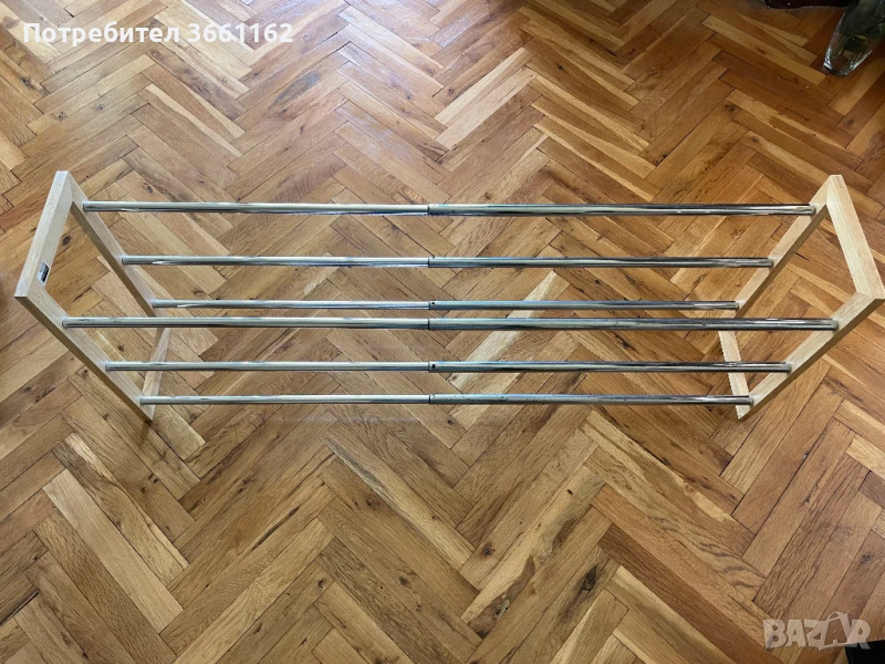 Разтегателен стелаж за обувки. РАЗМЕРИ: ВИСОЧИНА - 45,5см; ДЪЛБОЧИНА - 21,5СМ; ДЪЛЖИНА - 63,5СМ сгънат и 112см разгънат. Може да се разгъва, колкото желаете до 112см. Леки забележки по долните пръчки. Вътрешните са с идеална повърхност. Може да се разглоби и да се изпрати по Еконт или Спиди.