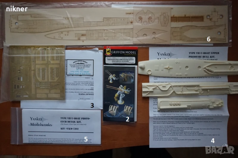 модел подводница в мащаб 1:72, състоящ се от: