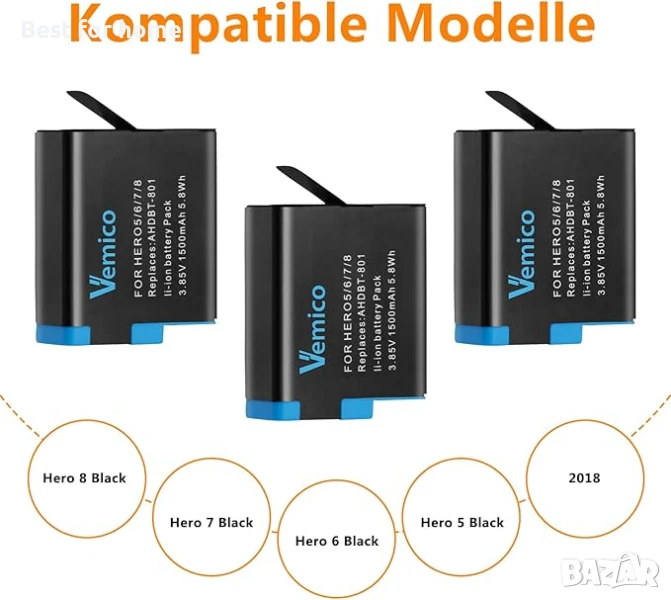 3 x 1500mAh висококачествена акумулаторна литиево-йонна батерия за GoPro Hero 8/7/6/5. Когато батерията се изтощи, просто поставете нова, за да поддържате камерата си GoPro работеща през целия ден.