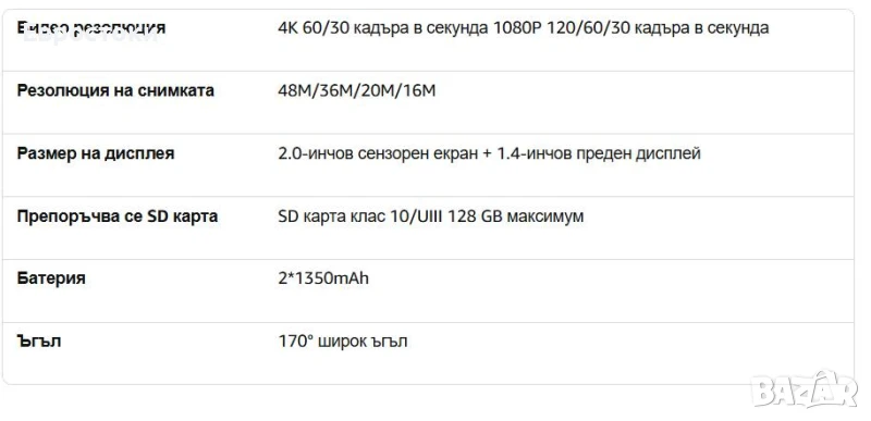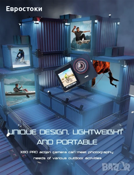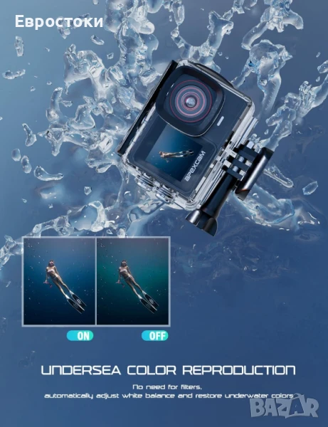 Водоустойчивост до 40 м: Тази екшън камера се предлага с водоустойчив корпус, който може да се използва до 40 м под вода. Идеална за гмуркане, сърф и други водни спортове. Така че можете да използвате камерата, за да записвате приключенията си, дори когато сте във водата.
