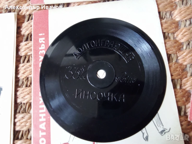 Лот стари мини плочи с книжки за всяка.На всяка от плочите има по една песен,а в книжките има нотите на песента и описание на танца.Плочите са диаметър 10 см.Снимал съм само две от тях.Всяка книжка е със съответната плоча.Цената е за всичките шест плочи.