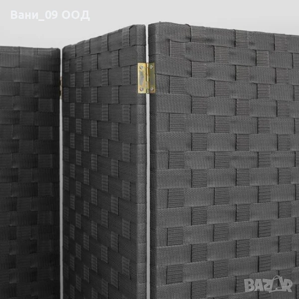 Декоративен сгъваем параван с дървена рамка и плетен дизайн в сив цвят. Състои се от 3 крила по 40 см, свързани с метални панти, което ви позволява да го разгънете според нуждите си.