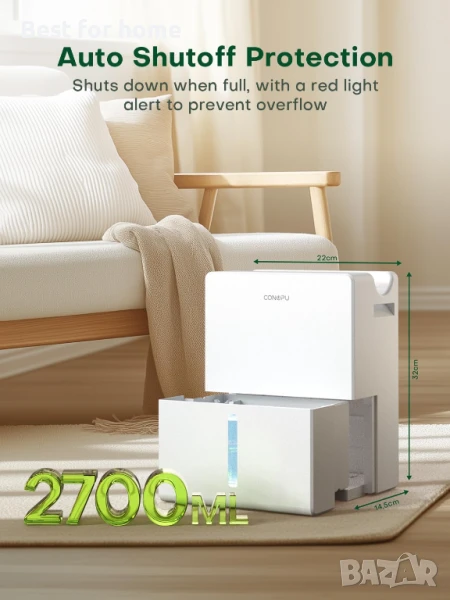 Голям резервоар за вода: Влагоабсорбаторът за спалня с голям резервоар от 2700 мл намалява нуждата от често изпразване. Той се изключва автоматично и ви уведомява, когато е пълен, за да предотврати преливане. Плъзгащият се дизайн опростява почистването.
