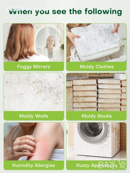 Съвети за употреба: (1) Препоръчителни условия: Използвайте в помещения от 5-20 м2, 15°C-40°C. (2) Поставяне: Не поставяйте обезвлажнителя близо до стени, дръжте отворите за вход и изход на въздух свободни. (3) Употреба на кутията: Подходящ само за модел CS12, не е приложимо за други модели; Извадете кутията от обезвлажнителя след изсъхване; Малко количество бял прах в кутията е нормално и не влияе на употребата.