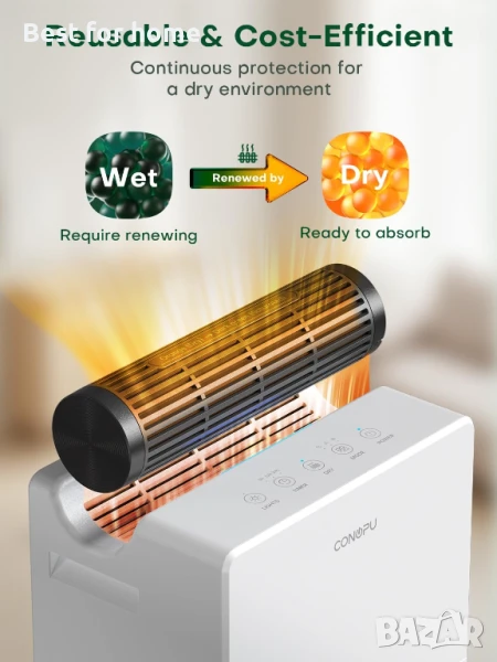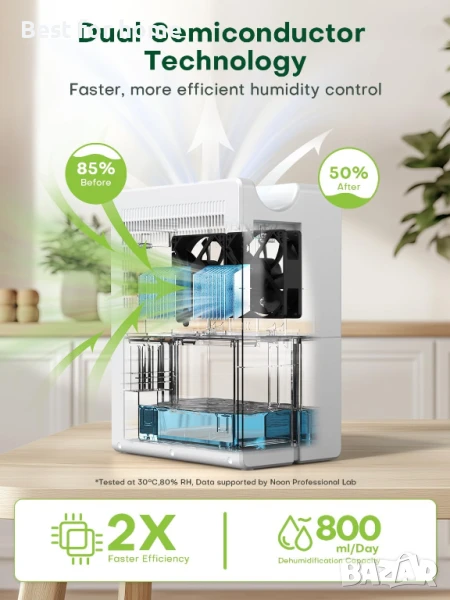 обезвлажнител CONOPU е два пъти по-ефективен от стандартните модели. Оборудван с 2 полупроводникови модула и 2 вентилатора, нашият домашен обезвлажнител може да отстрани до 800 мл излишна влажност на ден. Идеален за дневни, спални и бани от 20 м².