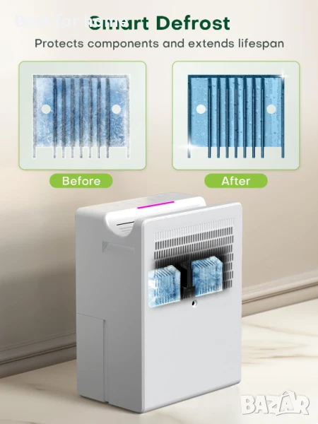Интелигентна защита при ниски температури: Режимът на автоматично размразяване позволява на домашния влагоабсорбатор да работи при ниски температури, което удължава живота му и го прави подходящ за всички сезони и среди.