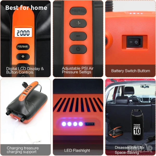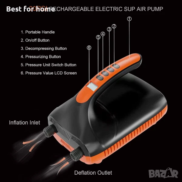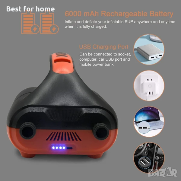 Акумулаторна помпа Sup, помпа за падълборд 20psi за надуваеми дъски и изпускане на парцела, бързо зареждане 110 V AC/12 V Dc, с интелигентна двустепенна функция за автоматично изключване за надуваеми дъски за падълборд