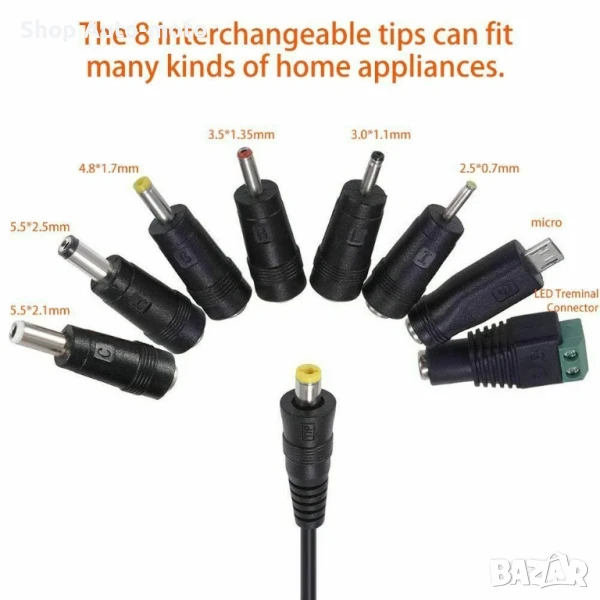 DC изход: 5.5x2.5мм, 5.5x2.1мм, 4.0x1.7мм, 3.5x1.35мм, 3.0x1.1мм, 2.5x0.7мм.