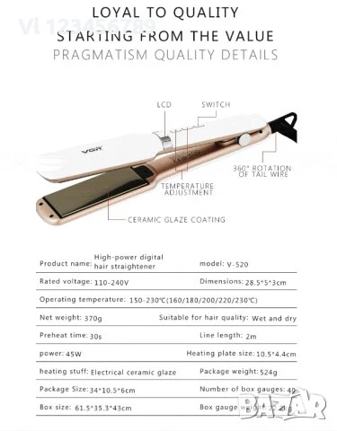 - Пресата за коса VGR 520 с керамично покритие предлага не само перфектно изправяне на косата, но и създаване на разнообразни прически и стилове, които ще отразят вашата индивидуалност. Този иновативен инструмент съчетава най-новите технологии с изискан дизайн, за да осигури качествени резултати при всяка употреба.