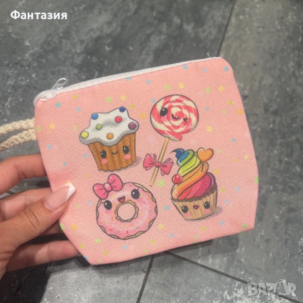 Чанта за плаж.Розов цвят с мъфини.Има си портомоне в същия десен.Закопчава се чрез цип.Нова е!