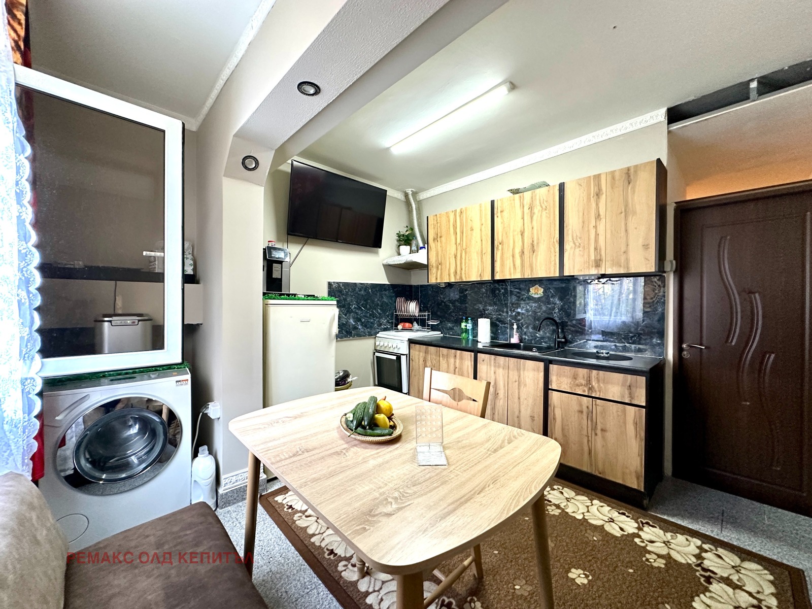 кухня, разширена чрез усвояване на терасата (удобно и практично решение, което увеличава кухненското пространство),
