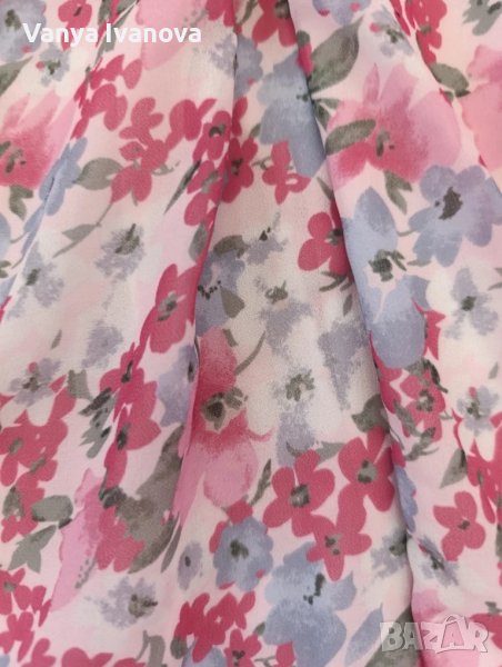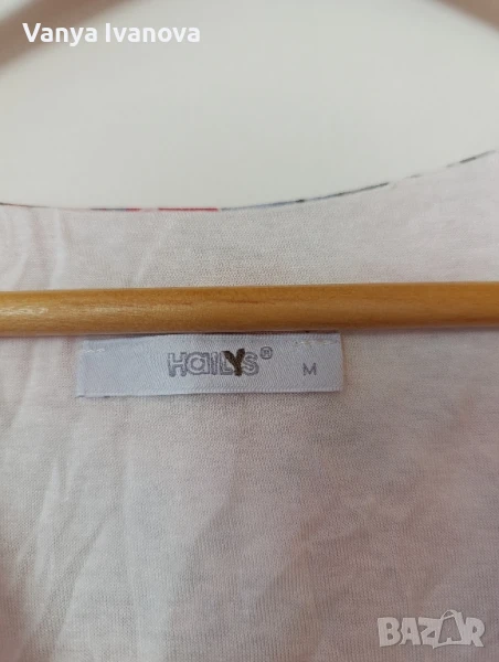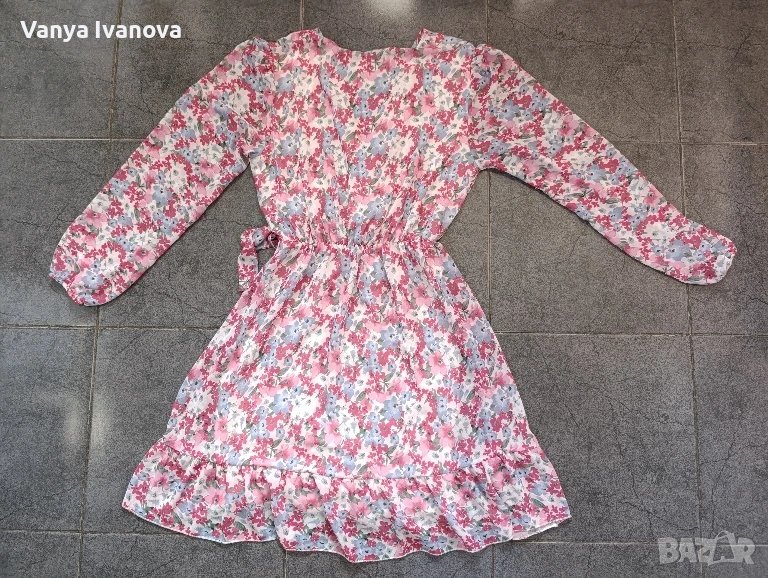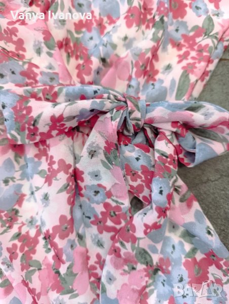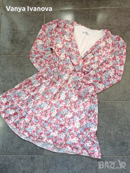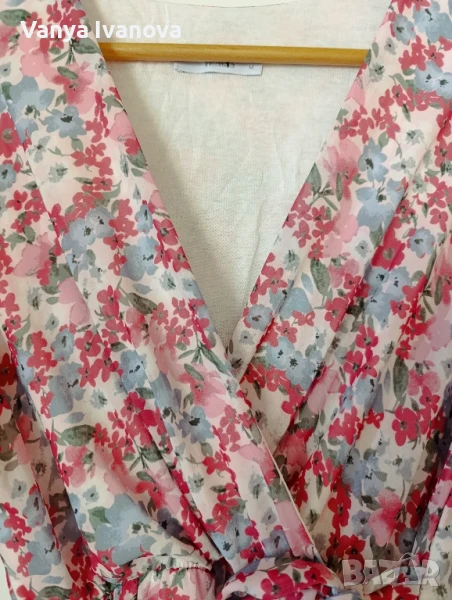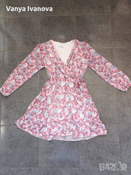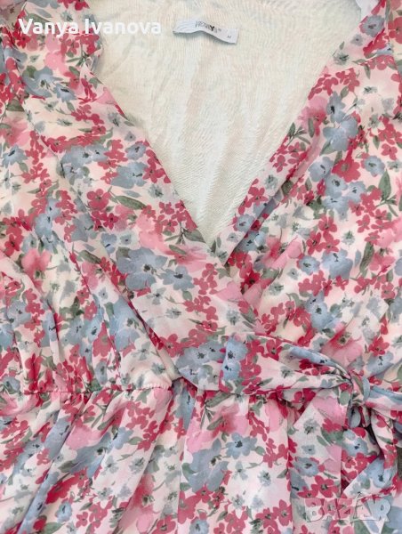 Красива, много нежна рокля на немската марка Hailys.Има подплата и не прозира,дълъг ръкав с ластик, има ластик и на талията, отпред има връзки .Без забележки.Материя полиестер, подплата вискоза.