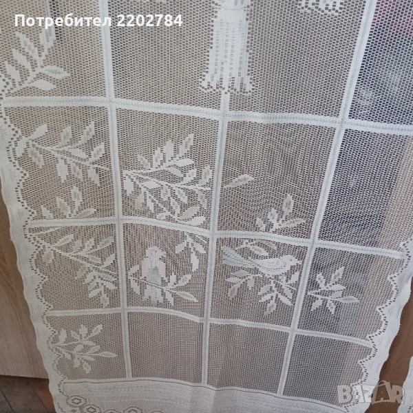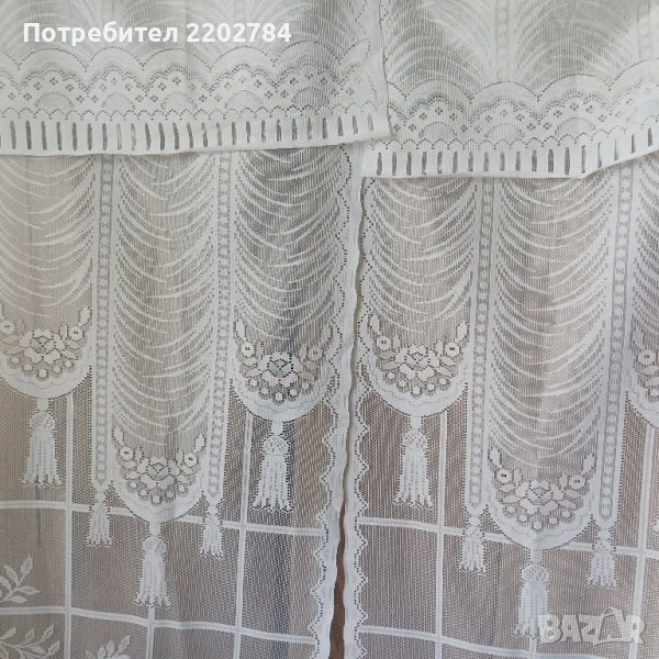 Вторите са комплект от два броя бели с различни картинки на двете пердета.Нови,без забележки.Размер на едното: ширина 60см, дължина 210см с ресните.С отвори за нанизване.