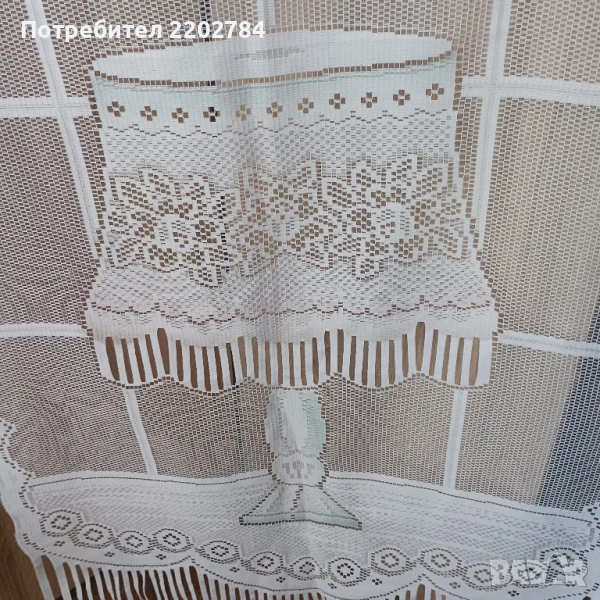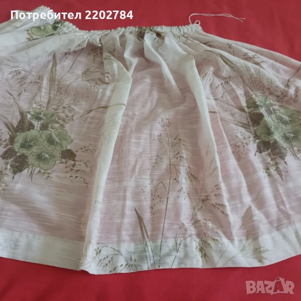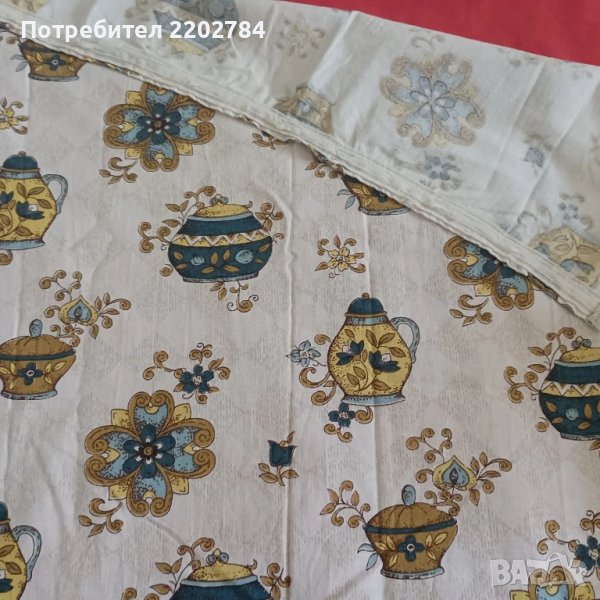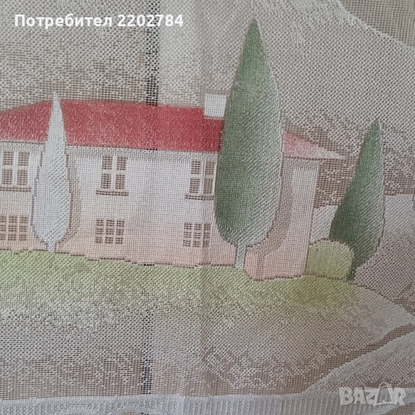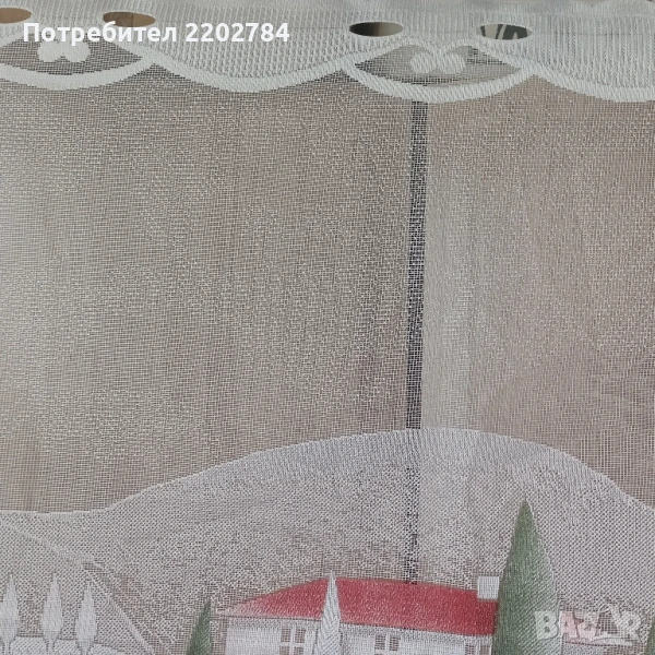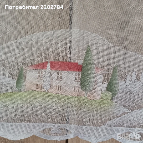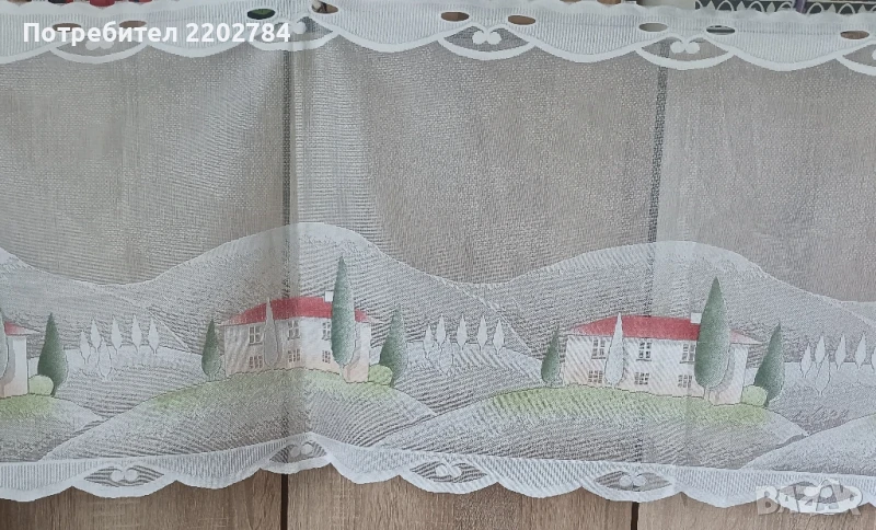 Трети са комплект от два броя нови пердета за долната част на прозореца.Много красиви щампи на къщи и дървета.За нанизване.Размер на едното- ширина 150см, дължина 50см.Без забележки.