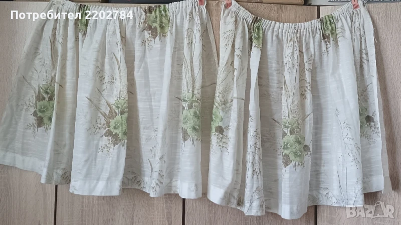 Последния комплект е също от два броя,използвани,но без всякакви забележки.Къси,за долната част или горната част на прозореца.С перделик без копчета.Ширината в горната част е 46см,но може да се среже конеца и да се използва цялата ширина на пердето като набора се направи от слагането на копчетата.Общата ширина е 145см.Дължина 55см.Това са размерите само на едното перде.Без забележки.
