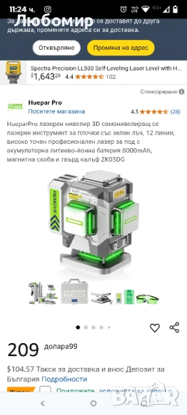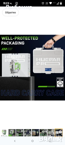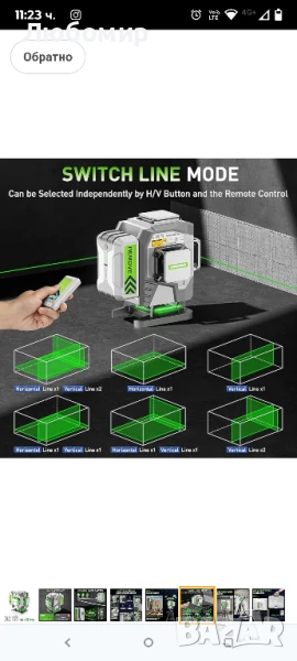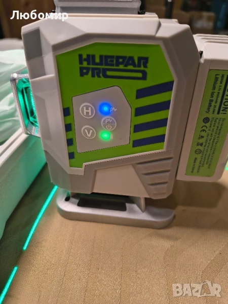 лазерен приемник Huepar (не е включен) при силна светлина или външни условия, импулсният режим разширява лазерния обхват до 200 фута (61 м). 3 x 360-градусовият зелен линеен лазер използва ярък зелен лазерен модул Osram с по-голяма стабилност и видимост. Той е лазер клас 2 (IEC/EN60825-1/2014),