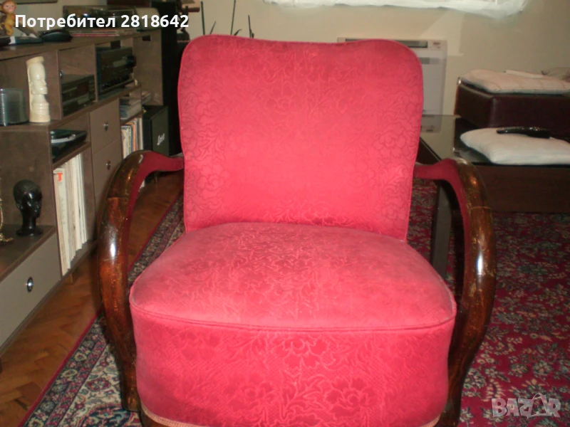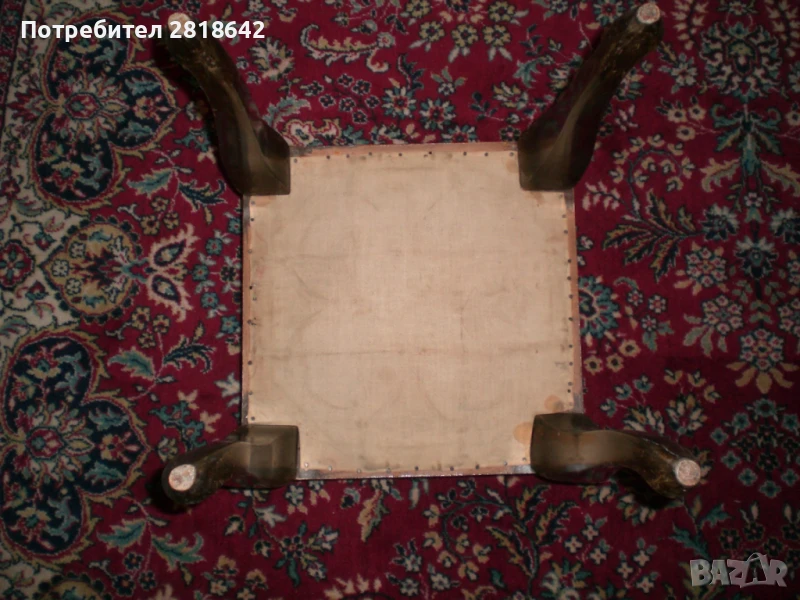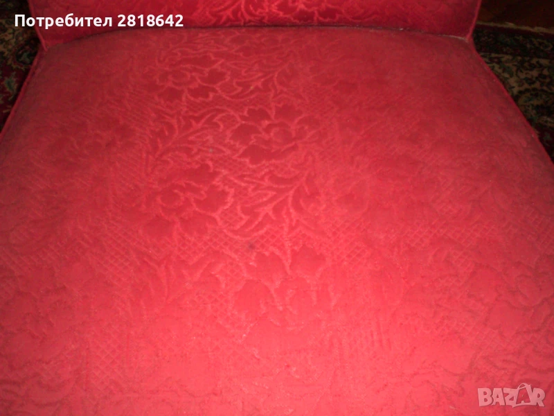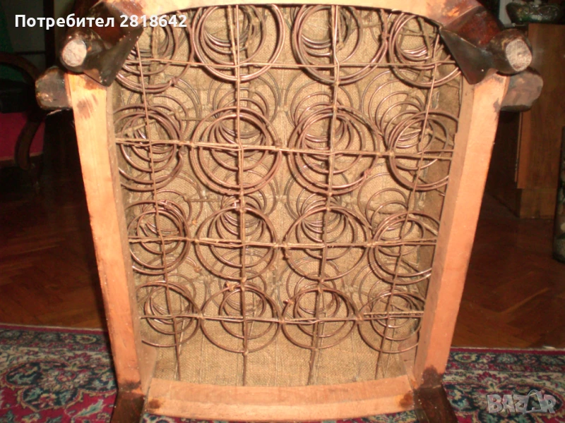 Масивно дърво. Пружините са в отлично състояние.Дамаската може още да се ползва или замени с нова или с калъфи. Аз я ползвам така. На табуретката дамаската е протрита и трябва да се смени, не че не може да се сяда и така. Канструкциите са здрави и по тях нищо не е правено над 40г. Цена 800лв. и само лично предаване или с еконт от дома с предварително заплатен транспорт. Може и с ваш травспорт, но се товарят след като са платени.