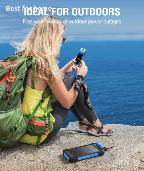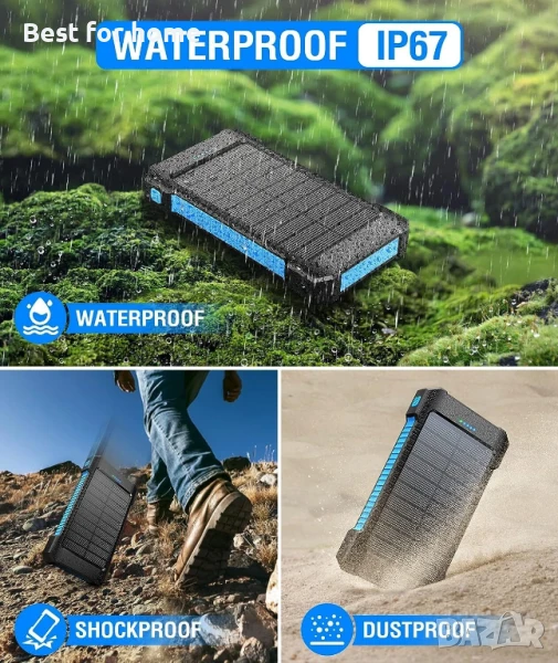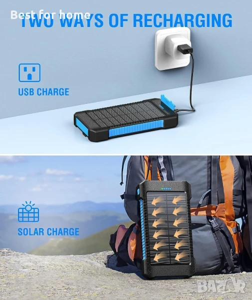 【По-безопасна батерия】Соларното зарядно устройство използва висококачествена литиево-полимерна батерия с висока плътност, което го прави по-компактно и безопасно от другите. Дългият живот и големият капацитет ви предлагат многократни зареждания, освобождавайки ви от притеснения от прекъсване на захранването по всяко време и навсякъде. Определено надежден източник на захранване за вас.