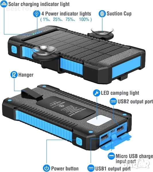 【Много портове и широка съвместимост】Слънчевото зарядно устройство е проектирано с три USB порта за зареждане. Два USB изхода ви позволяват да зареждате две устройства едновременно. Входният порт е за зареждане на самата батерия. Кабелът за зареждане е включен, което ви спестява разходи за закупуване на кабели за зареждане. То е широко съвместимо с повечето USB устройства за зареждане.