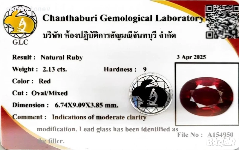 рубин с тегло 2.13кт. и произход Мозамбик. Чистота I1-I2 с минимално видими включения. Цвета му е червен. Класическа овална форма с размери: 9.09 x 6.74 x 3.85 mm.