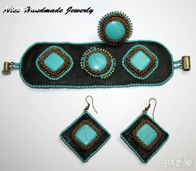 Комплект с тюркоаз - гривна, пръстен и обеци /естествена кожа, бродерия с мъниста/. Ръчна изработка.