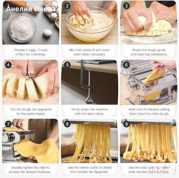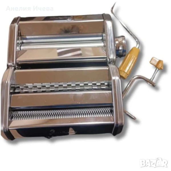 Тяло от неръждаема стоманаЛесно регулируем диск със 7 позиции (от 1 до 7) за настройка на желаната дебелина на разточване минималната дебелина на номер 7 приблизително 0.3 ммДвойна режеща глава за фетучини/талиатели и спагетиВ комплекта са включени ръчна манивела и скоба с пластмасови дръжки Скоба за монтаж на машината за паста върху кухненски плот Почиствайте редовно стъргалата под гладките валове с домакинска хартия или суха кърпа, никога не мийте машината с вода или в съдомиялна машинаЗа да почистите след употреба използвайте четкаМашината за паста е отличен избор за тези, които желаят да се насладят на качествено приготвена домашна паста.