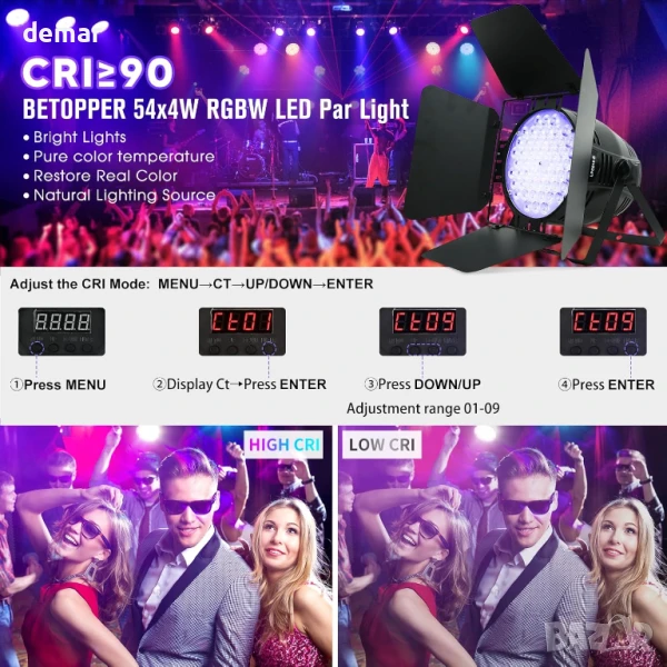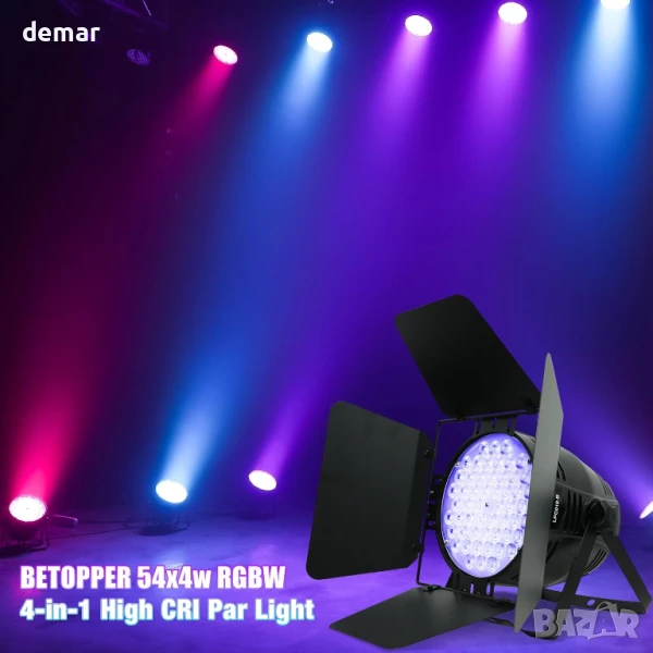 Тази сценична лампа с висок CRI предлага ярко и реалистично възпроизвеждане на цветовете с CRI над 90, идеална за сватби, театри и фотография. Оборудвана с 54 x 4W RGBW светодиода, осигуряващи до 5000 лумена, тя произвежда ярки, чисти цветове с подобрени бели тонове. Четири регулируеми ламели позволяват прецизно оформяне на лъча за различни сцени. Поддържа DMX, звуково активиран и автоматичен режим с вградени цветове и разполага с ефективна система за охлаждане за надеждна употреба на закрито или на открито. Удълженият дизайн на корпуса подобрява разсейването на топлината, покритието на лъча и общата издръжливост.