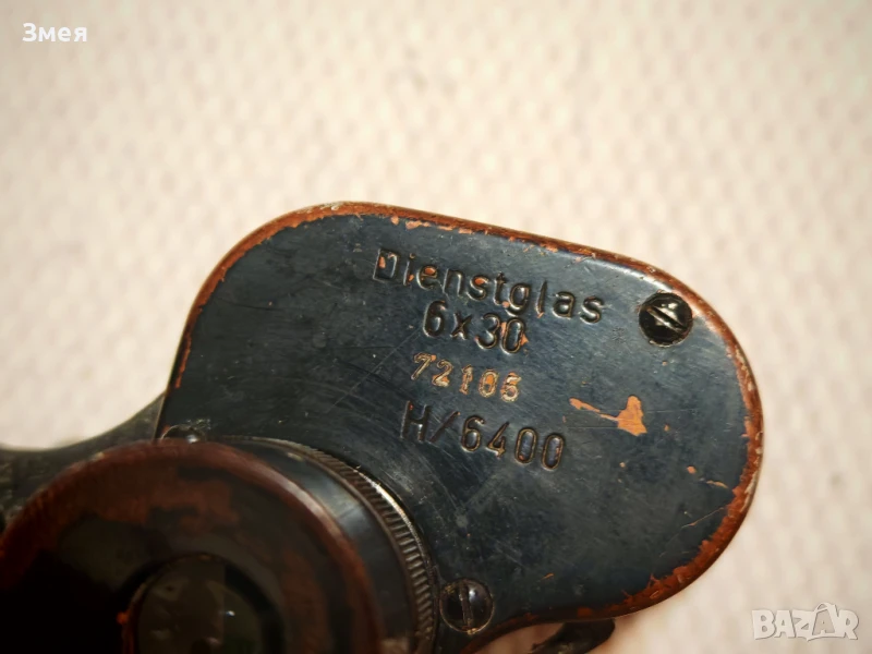 Бинокъл от втората световна война с код cag "Swarovski" Dienstglas 6x30 сериен номер 72105. Оптичните елементи са чисти, механиката работи отлично, мерителна скала отдясно. Без комплектовка.